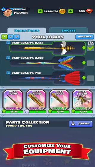 2. By playing this game and winning matches, you can unlock a variety of new props that can be used to customize your darts! With new dart barrels, dart shafts and dart wings, your darts will have unique appearance and gain performance improvements;