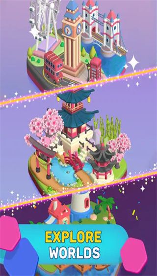 The uniquely shaped hexagonal tiles are the protagonist of the game, and a varying number of placement areas are drawn on the board. You need to move the tiles around in a limited area and place tiles of the same color in the same position. The game unfolds in the form of levels, and during the process of clearing levels, many buildings will be given beautiful colors. The characteristic buildings from different countries will become the best memory for you to pass the level.