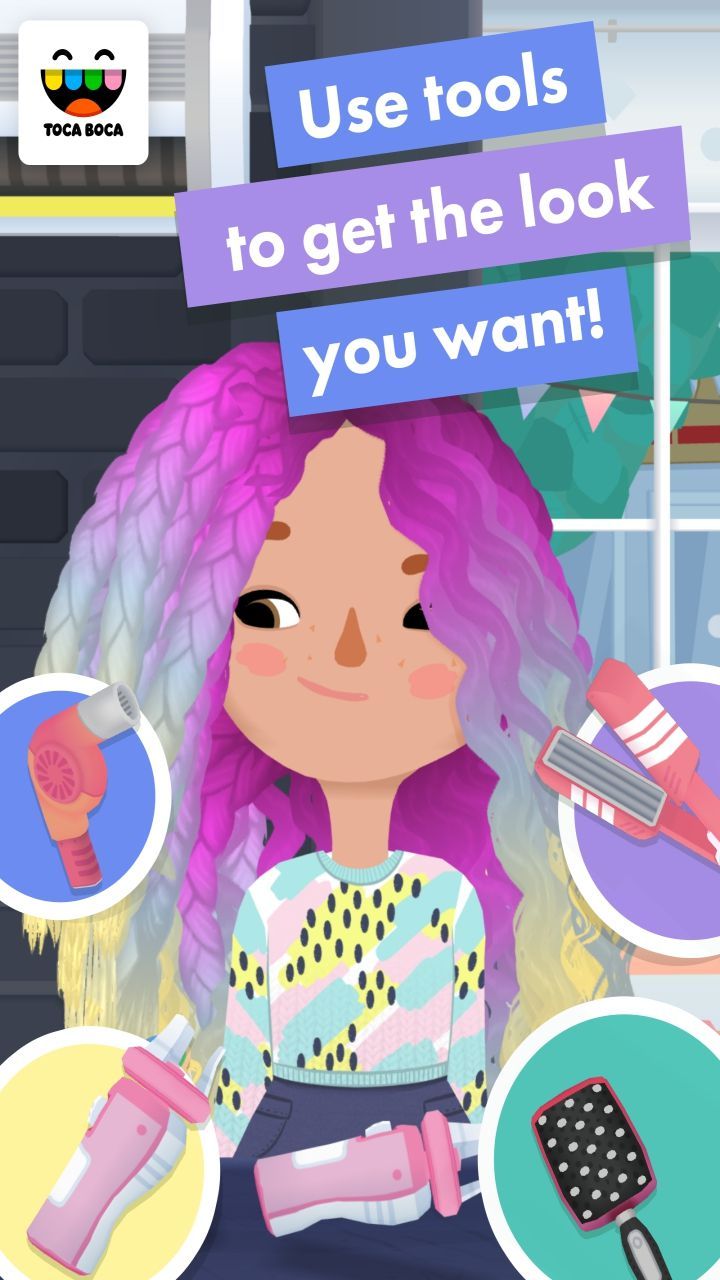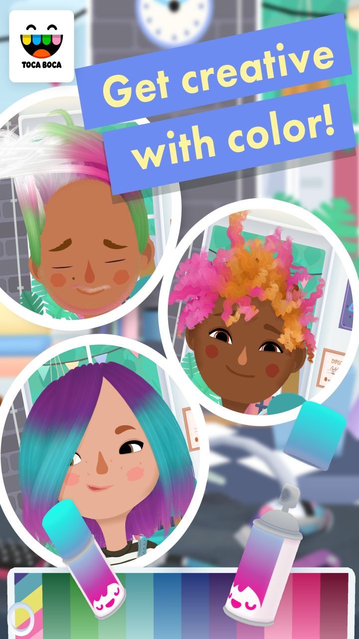 Color: Ready to color? Toca Hair Salon 3 introduces a more advanced hair coloring tool that uses two different containers for different sized sprays. And, the new rainbow sprayer lets you spray and dye your hair as many times as you want for a colorful, dreamy look!